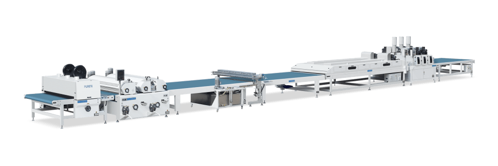 The L10A-1950 curtain coating production line is specially designed for wide-format, large-scale substrates that require premium high-gloss surface finishing. It is ideal for coating materials such as marble-effect panels, melamine (three-amine) boards, and other decorative wall panels. This advanced system delivers a mirror-like finish with exceptional smoothness, brilliance, and durability—perfect for high-end interior decoration applications. The complete line is composed of a dust cleaner, forward and reverse coater, curtain coater, 12-meter IR heating oven, and a three-lamp UV curing unit. Engineered for industrial-scale production, the L10A-1950 offers stable coating performance, consistent quality, and excellent efficiency, meeting the demands of modern architectural and decorative panel manufacturing.